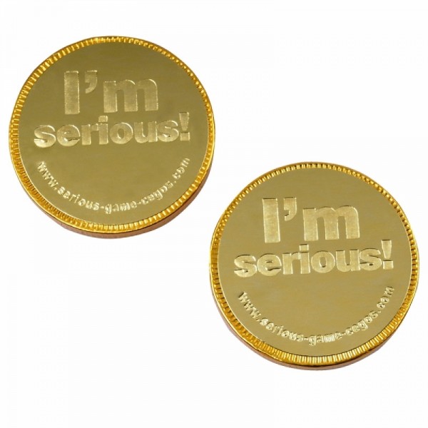 Čokoladni cekini iz mlečne čokolade, velikosti ?3,8 cm z odtisnjenim logotipom na eni strani. Zaviti v srebrno ali zlato folijo. Minimalna količina: 1000 kos. Cena po povpraševanju.