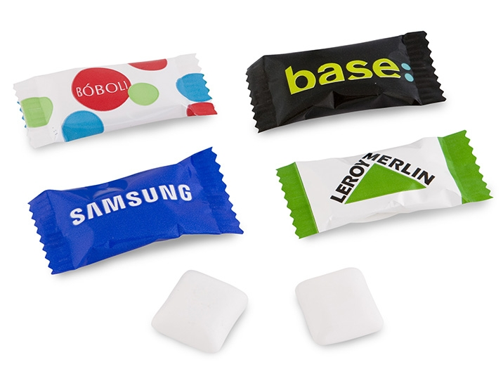 Žvečilni gumi v samostojnem Flow pack pakiranju, oviti so v bel ali transparenten papir, ki ga potiskamo po vašem designu.
