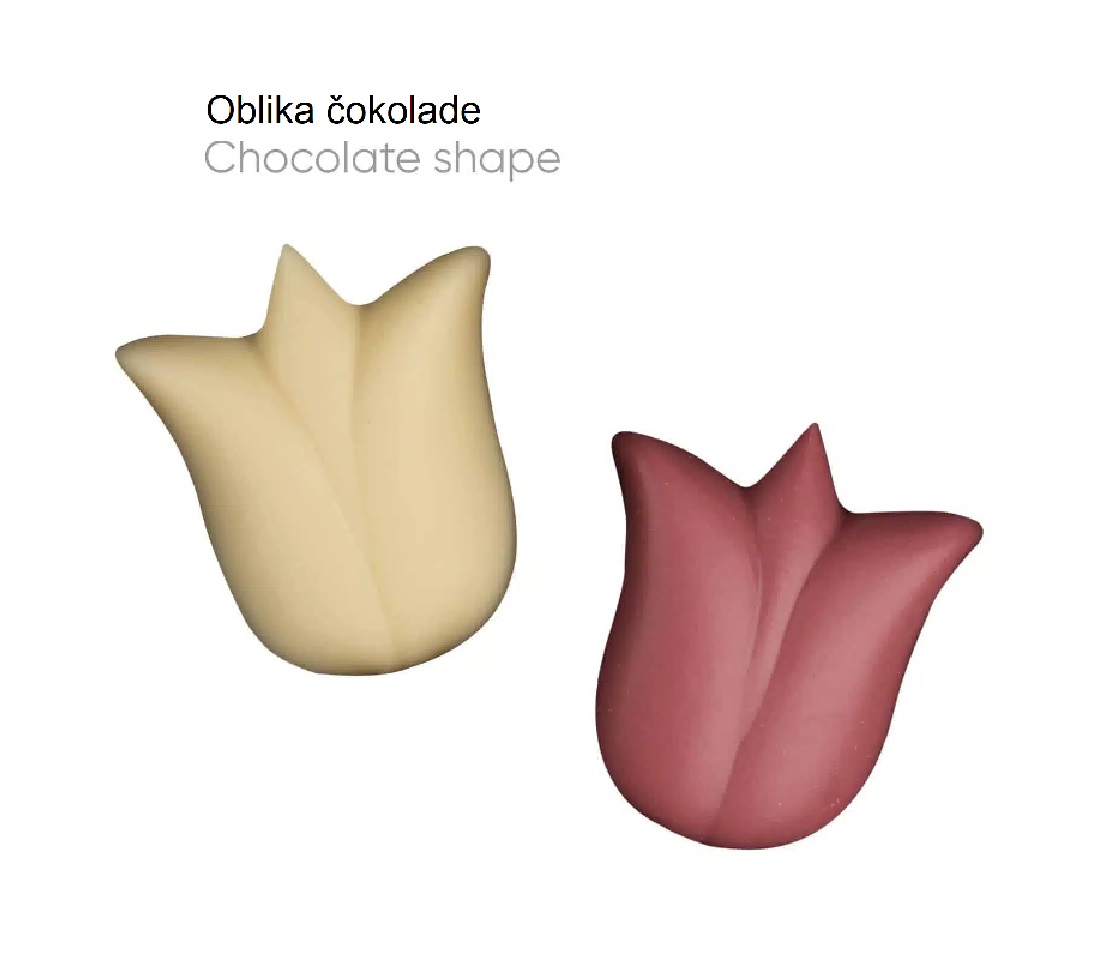 Tulipani so neločljivo povezani s pomladjo – njeno lahkotnostjo in svetlimi barvami. Takšne asociacije vzbuja tudi naš komplet štirih čokoladnih tulipanov.