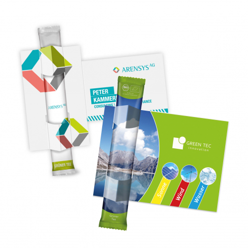 Paličasta vrečke v obliki palčke, napolnjene s čajem, potiskana po vašem designom s kartico (letak, vabilo, vizitka,…)