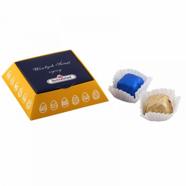 4 ročno izdelani čokoladni bonboni v darilni škatli. Okus: lešnik, kava, čokoladna pena. Minimalna količina: 250 kos. Cena po povpraševanju.