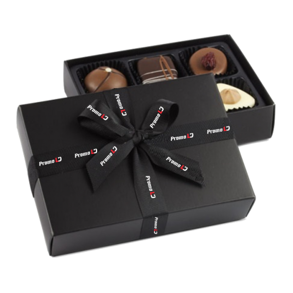Čokoladni pralini v črni darilni škatli. Črna barva povdari eleganco in ravne linije. Pralini so ročno izdelani.