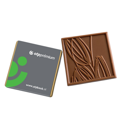 Personalizirane čokoladne ploščice z logotipom, belgijska in francoska čokolada, idealno promocijsko darilo.