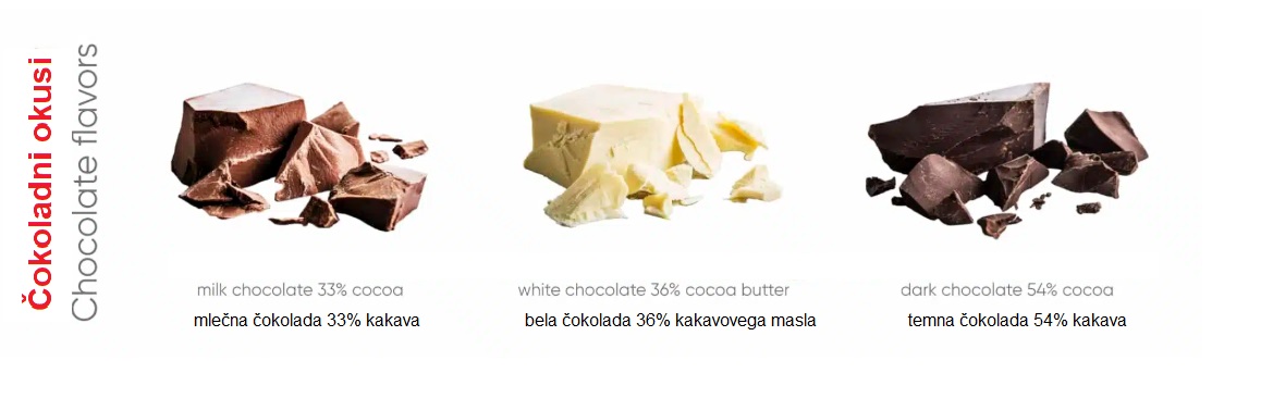 Možnosti izbire: mlečna čokolada (33 % kakava), bela čokolada (27 % kakavovega masla), temna čokolada (57 % kakava).