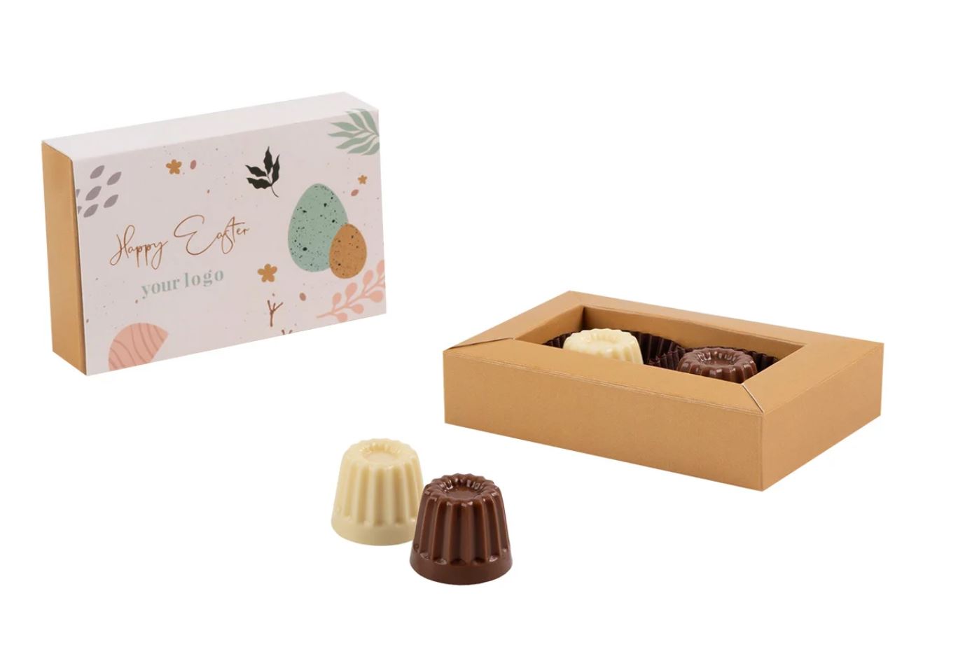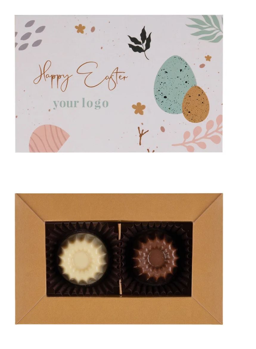 Velikonočna pralina v obliki kolačka z logotipom. Je elegantno promocijsko darilo za podjetja, primerno za sezonske velikonočne kampanje.